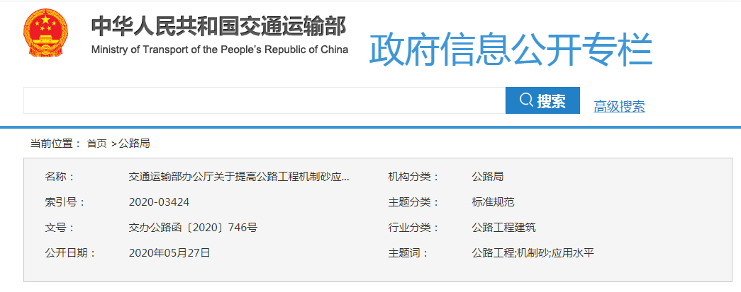 但是,今日機(jī)制砂行業(yè)迎來(lái)新的曙光,為解決河砂緊缺局面,交通運(yùn)輸部發(fā)布《交通運(yùn)輸部辦公廳關(guān)于提高公路工程機(jī)制砂應(yīng)用水平的通知》,對(duì)機(jī)制砂石質(zhì)量給出具體參考標(biāo)準(zhǔn),各地可結(jié)合實(shí)際情況在應(yīng)用過(guò)程中制定實(shí)施細(xì)則,不斷加強(qiáng)機(jī)制砂生產(chǎn)與應(yīng)用過(guò)程中的質(zhì)量管控,確保機(jī)制砂質(zhì)量。